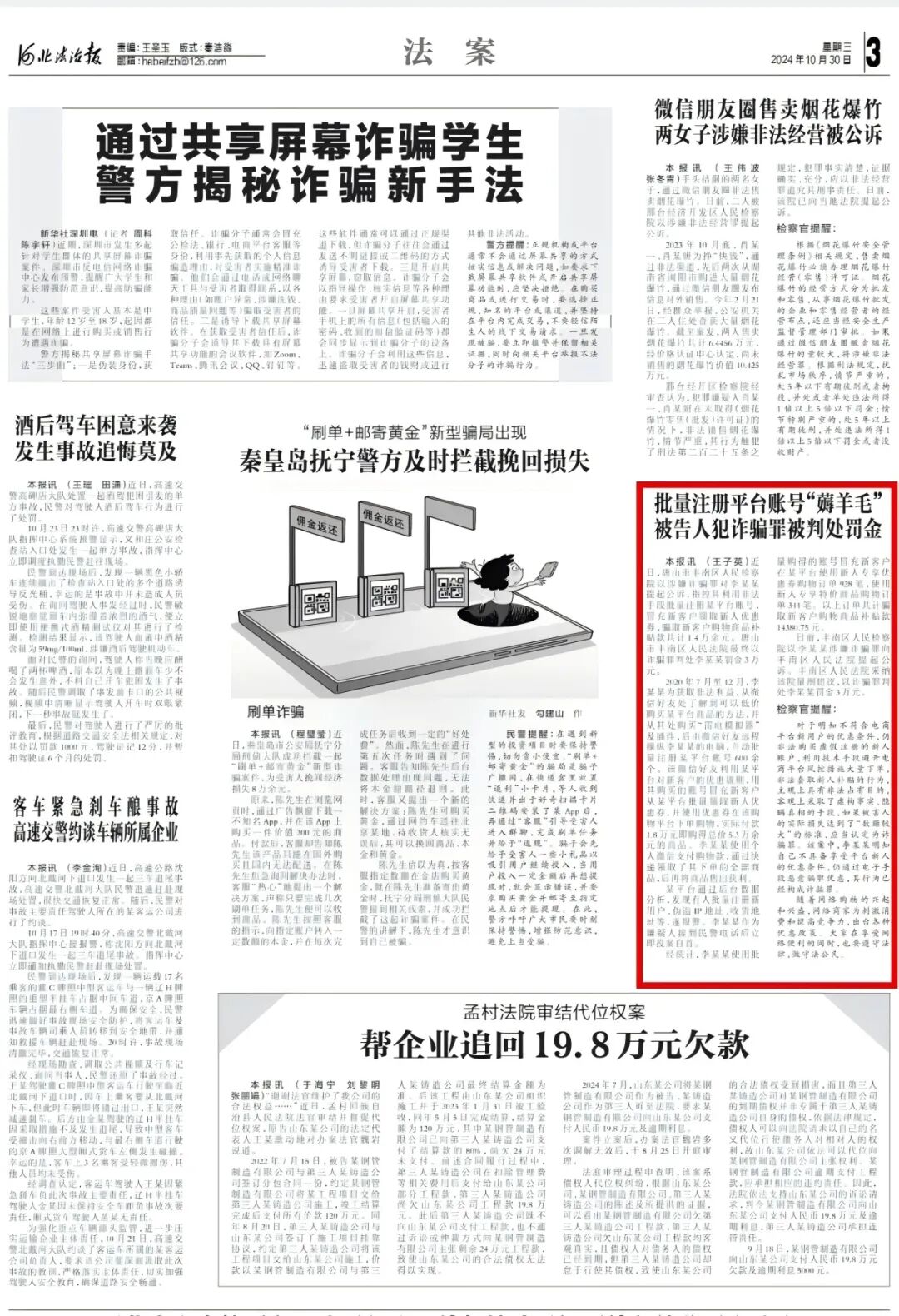 本报讯 (王子英)近日,唐山市丰南区人民检察院以涉嫌诈骗罪对李某某提起公诉,指控其利用非法手段批量注册某平台账号,冒充新客户领取新人优惠券,骗取新客户购物商品补贴款共计1.4万余元。唐山市丰南区人民法院最终以诈骗罪判处李某某罚金3万元。
